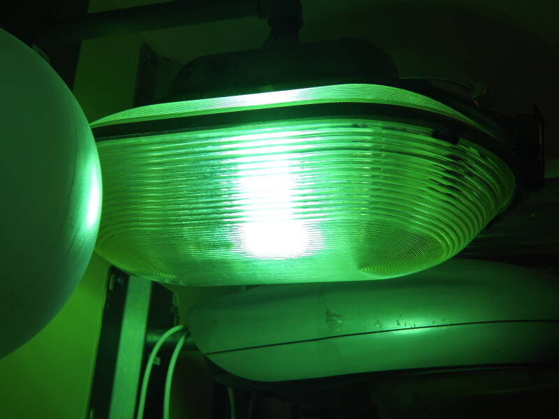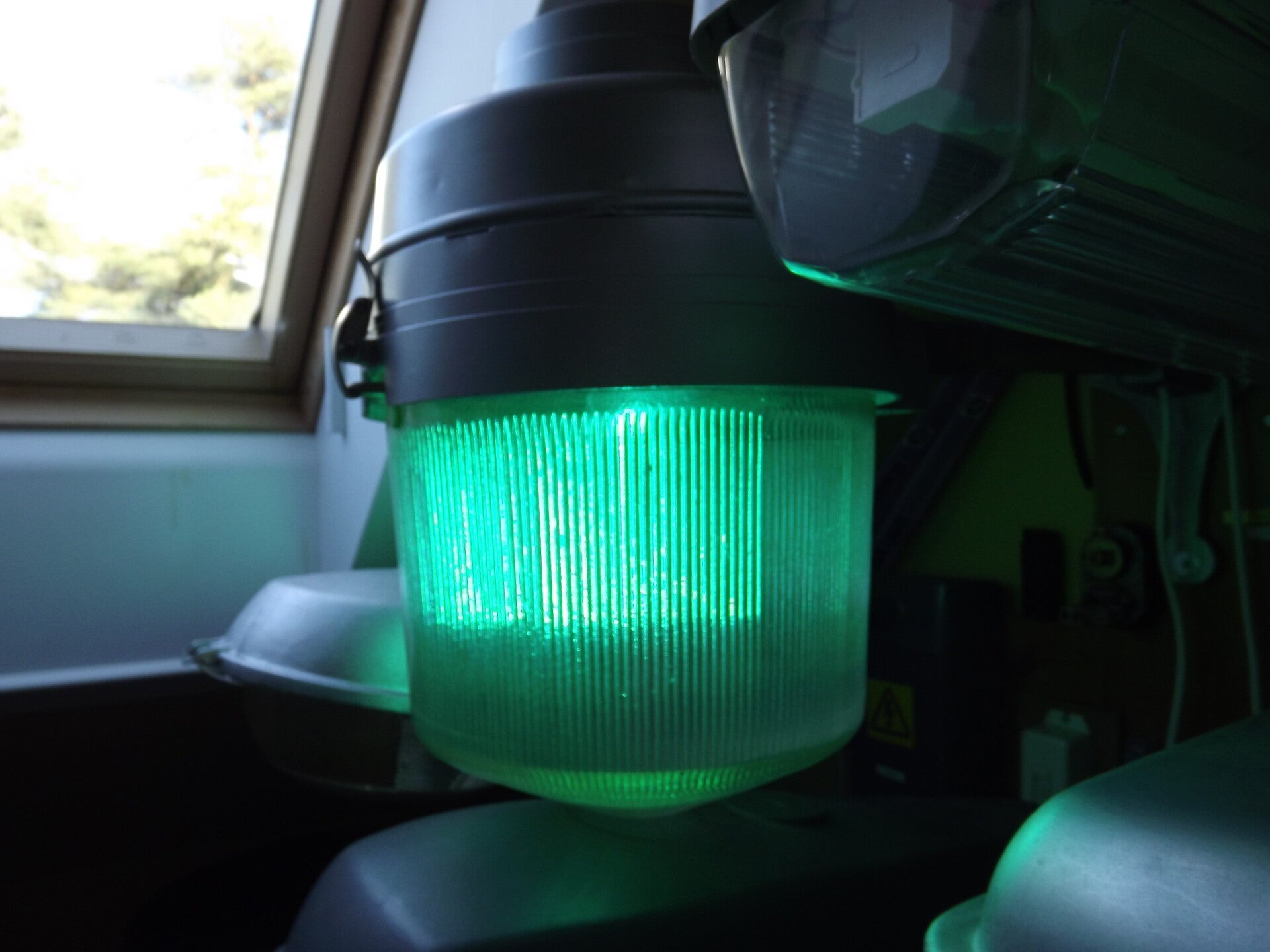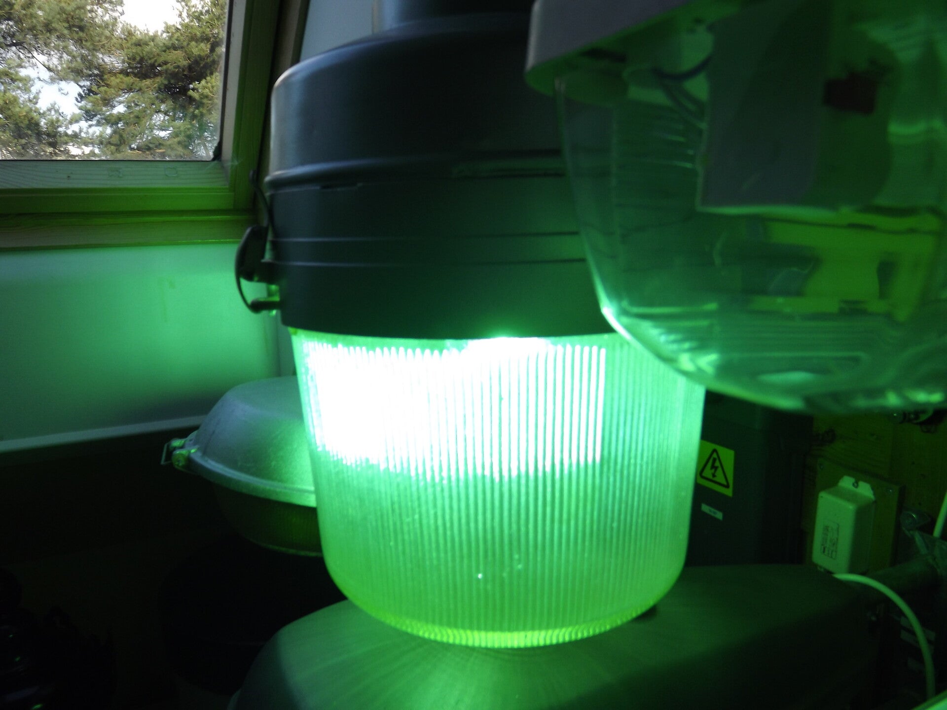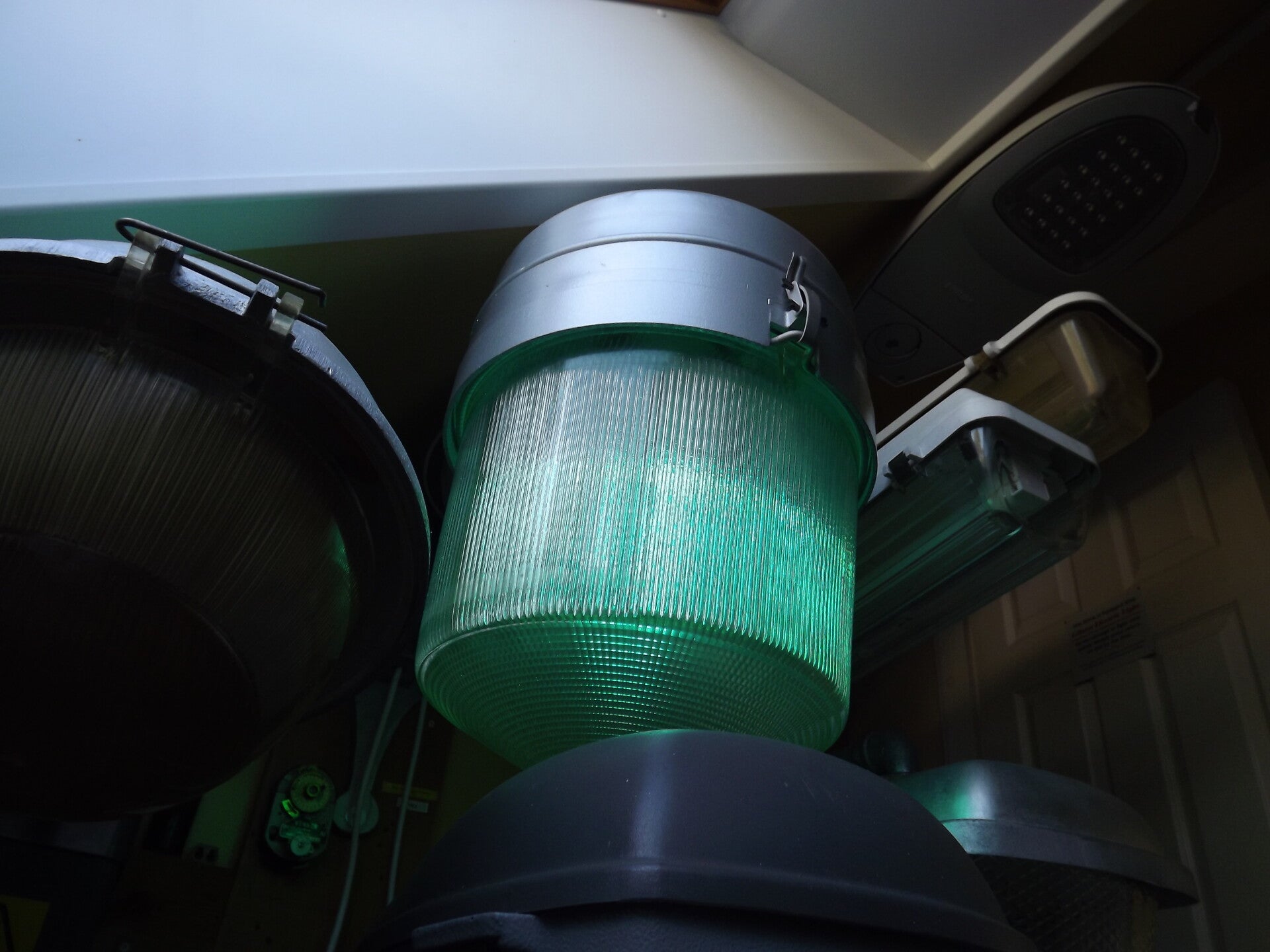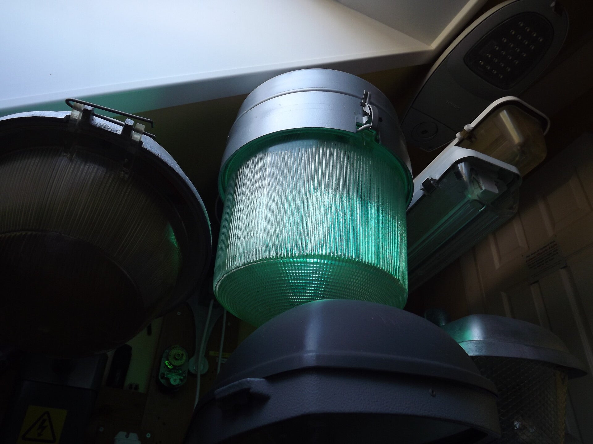The penultimate lantern in the room to be put in the spotlight was the GEC Z8431 (aka Dioptrion) for 250W MB/U lamps. This one was given the opportunity to warm up. Owing to the lanterns similar shape to a cut gemstone, and it's colour, I likened it to an emerald among the gems.