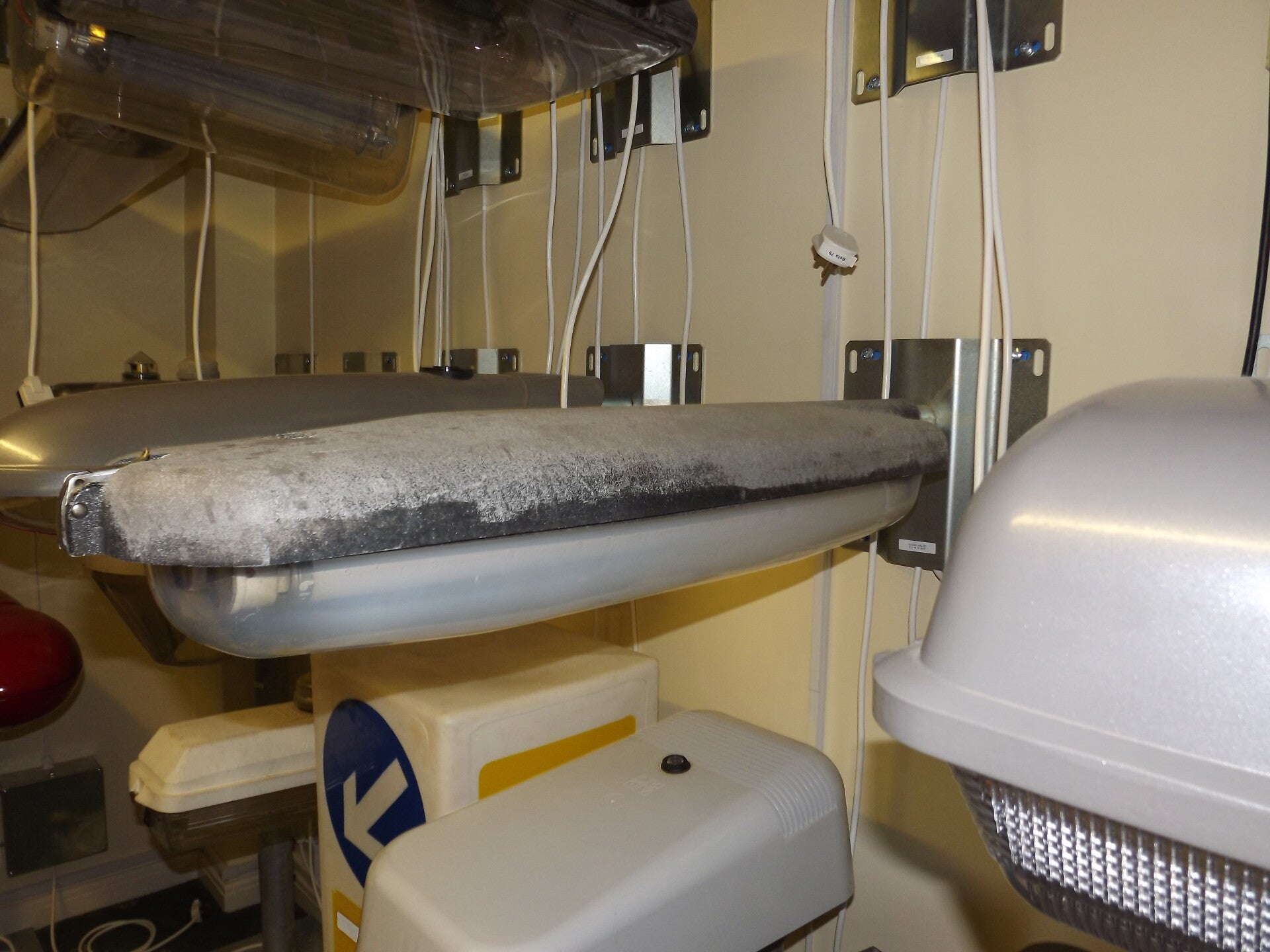The next room I would visit was the (first) overspill lantern room. Seeing them all installed in a grid on every wall was quite the sight! There are seventeen lanterns visible in the first image! The lanterns from left to right are: Thorn Isaro Pro S, Holophane QSM, WRTL MRL6, Thorn Alpha 4, Thorn Civic 2, Thorn Pilote T2, AC Ford AC730, Philips MA90-GO, GEC Z9464, WRTL Vectra X, WRTL Arc 90, Simplex Lucidor, CU Phosco P567A, GEC Z9539, Wardle Avon, GEC Z5530, and a Wardle Murray.