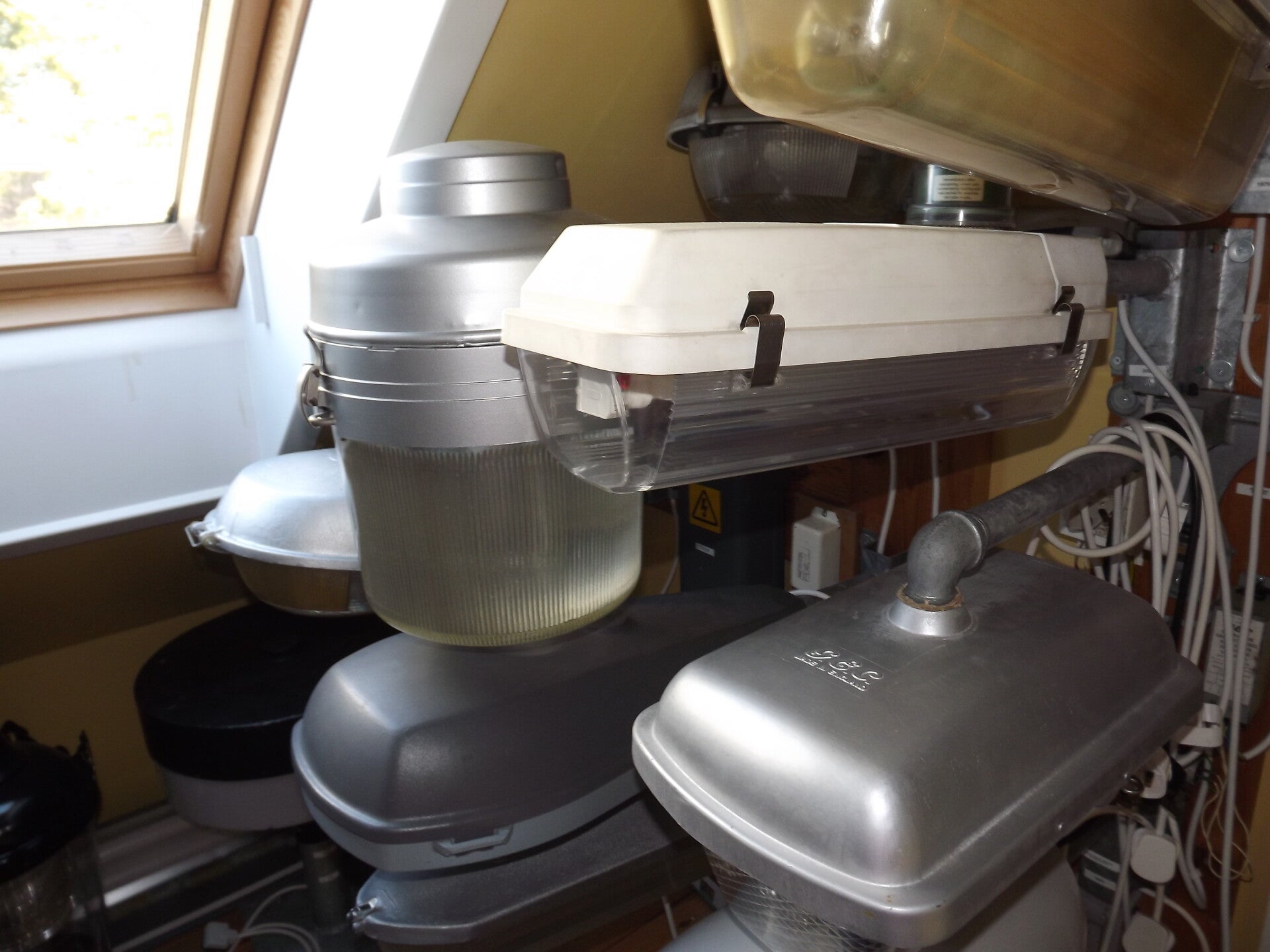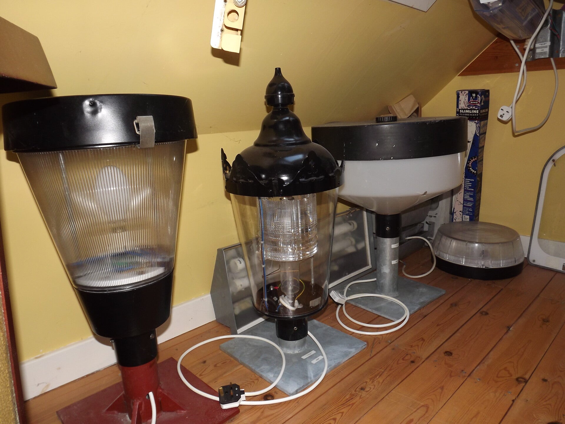 The loft was the next place to be visited, with the first lanterns to be located adjacent to the doorway. From left to right, top to bottom, the inventory of this photo are: a Thorn Beta 7, Simplex Aries 55, GEC Z8128B Clearmain Difractor, Philips FGS104, GEC Z8896, Urbis ZX1, GEC Z9481, Philips SGS252, Phosco P111, Phosco P178, ELECO GR501.