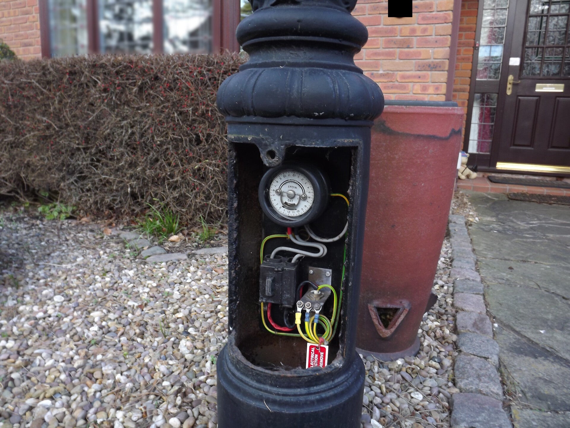 The time-switch and cut-out are present in the base compartment, but the lantern now runs on photocell control.